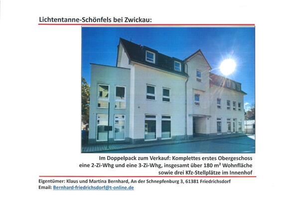 Aus Altersgründen: Komplette Wohnetage mit insgesamt ca. 180 m² Wohnfläche in Lichtentanne-Schönfels zu verkaufen. Die 3-Zi-Wohnung mit 104 m² ist revoviert und bezugsfertig; die 2-Zi-Wohnung mit 75 m² ist zur... mehr erfahren